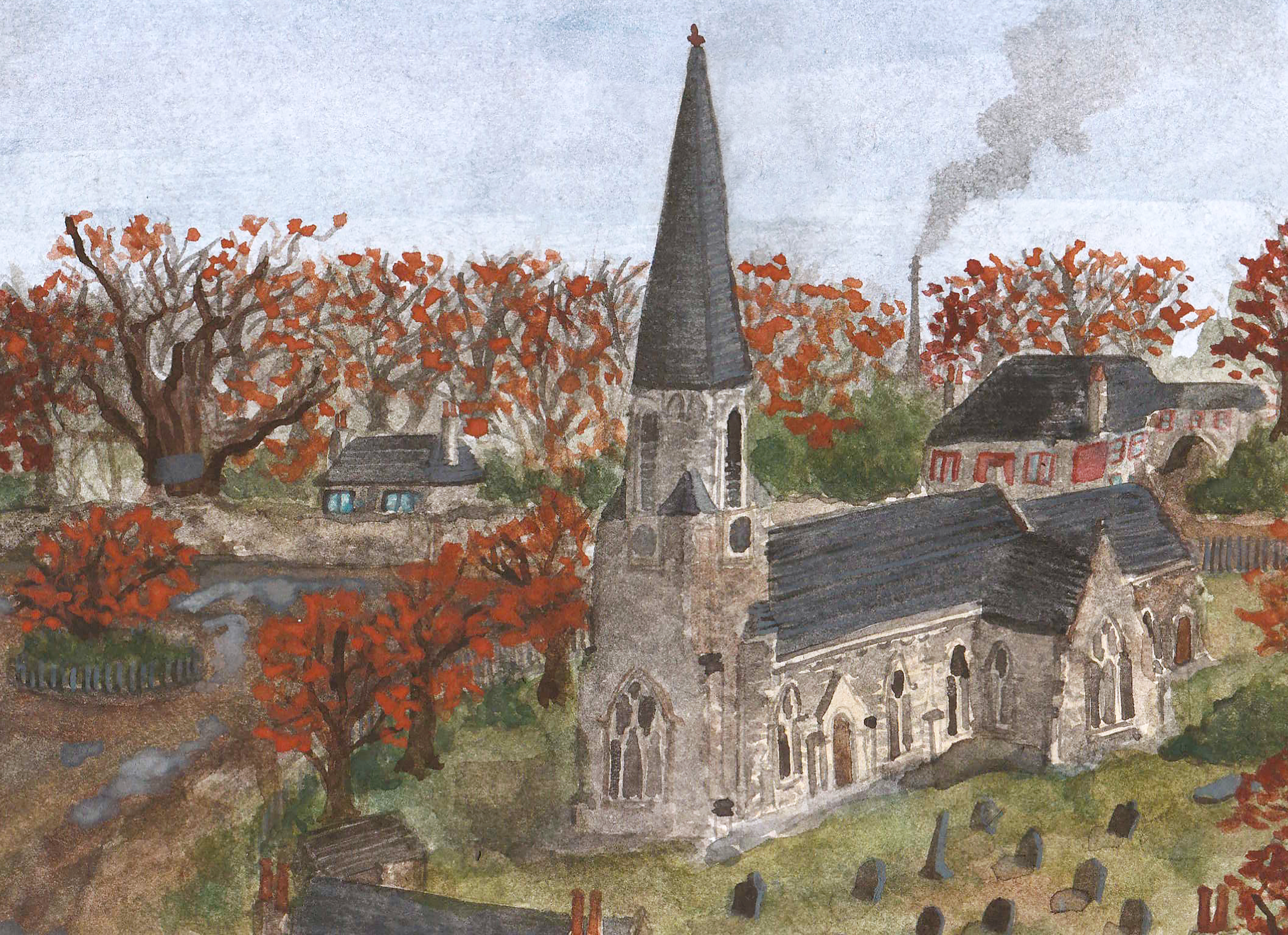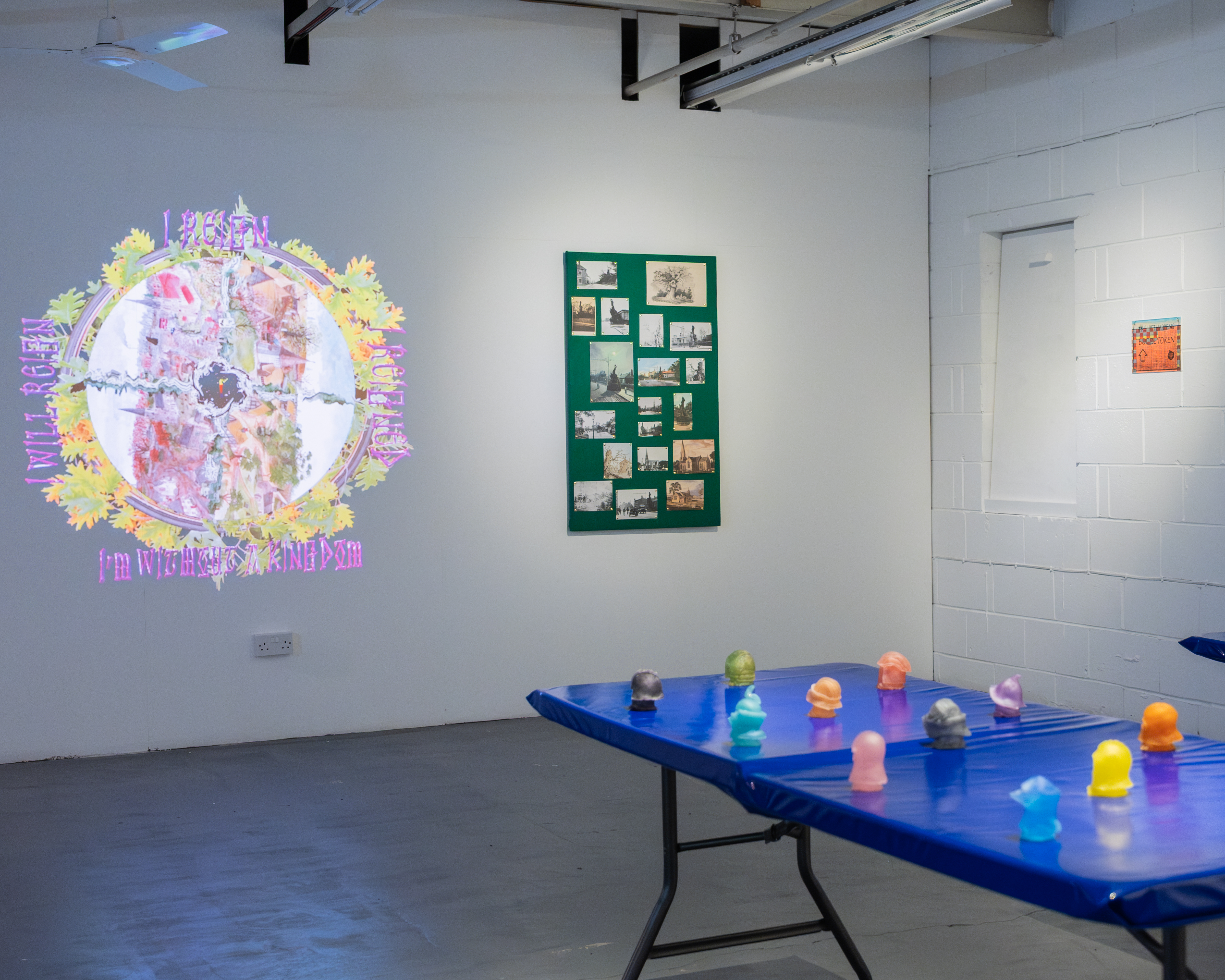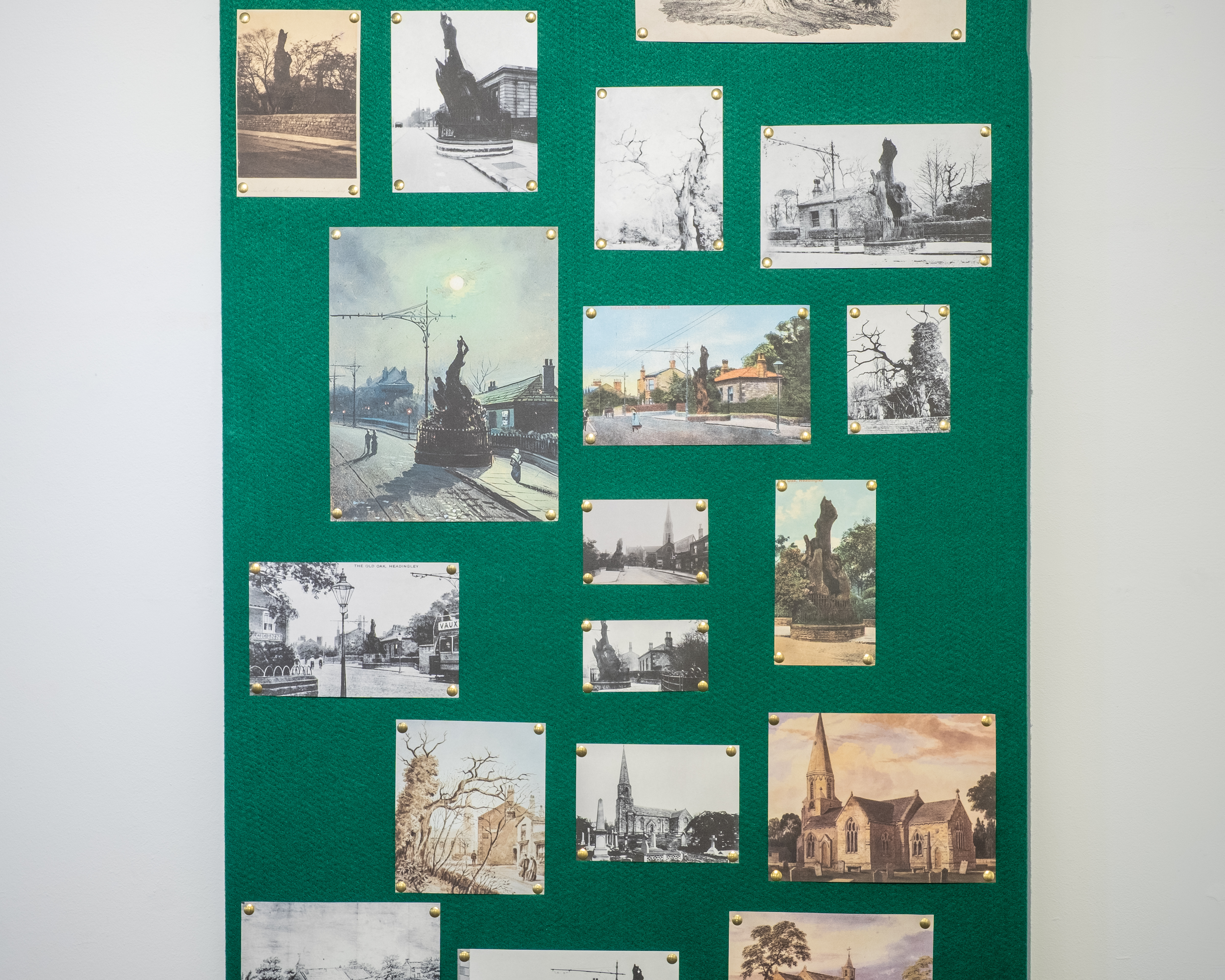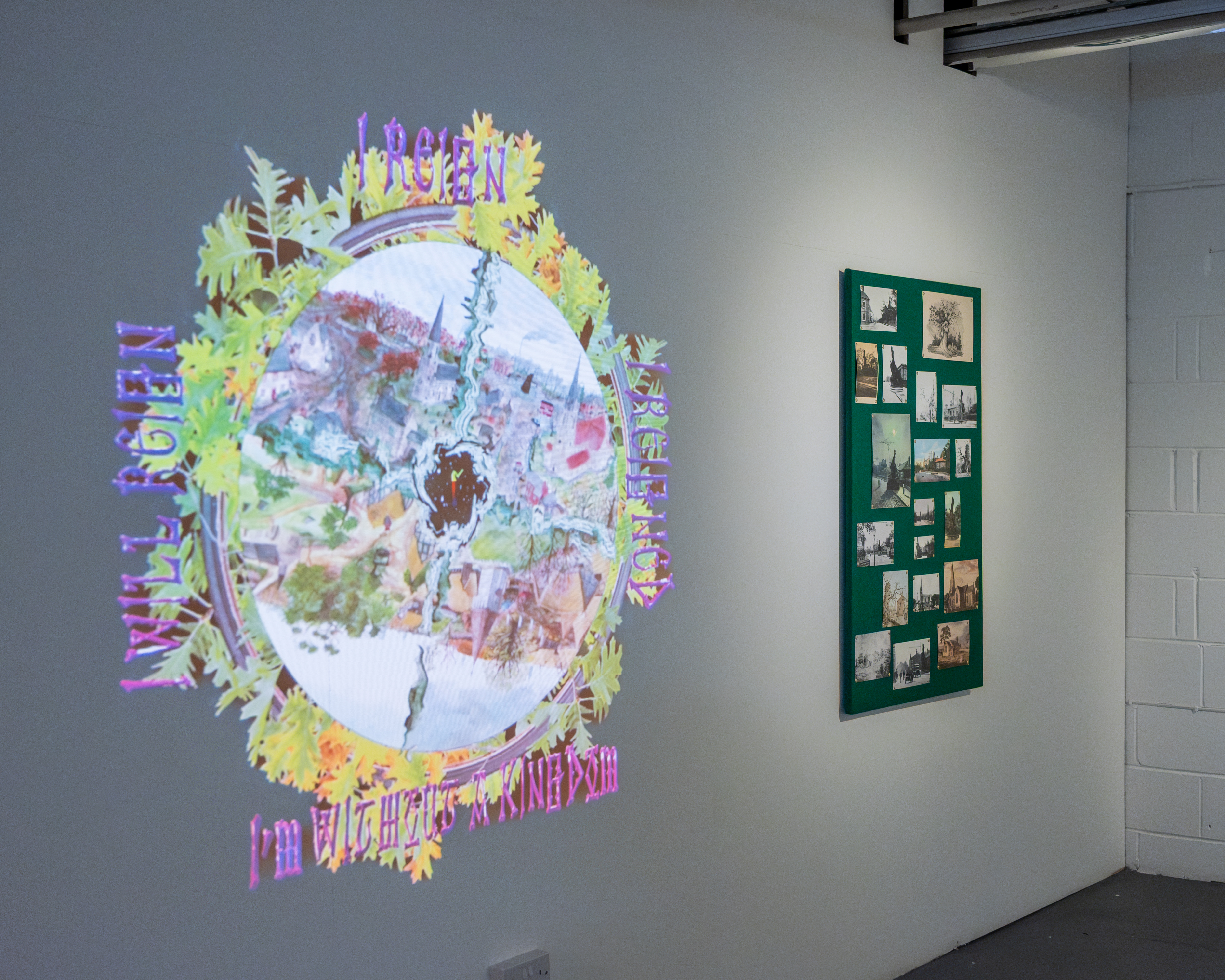 Projected beside a noticeboard pinned with scanned images is a ‘wheel of time’. Within four illustrated panels, this piece depicts the life of the legendary Skyrack tree in Headingley, which stood for a thousand-plus years until it was felled in the 1940s. It is believed that the Vikings named the wapentake of Skyrack after this oak tree.The name ‘Skyrack’ derives from the Old Norse ‘skyr āc’ translating to ‘shire oak’. The symbol at the centre of the wheel: ’ᚪ’ is the Viking rune for the word ‘āc’, thus translating to ‘oak’. The text on the outer edge is taken from medieval depictions of Fortune’s Wheel: ‘I will reign’; ‘I reign’; ‘I reigned’; ‘I’m without a kingdom’.