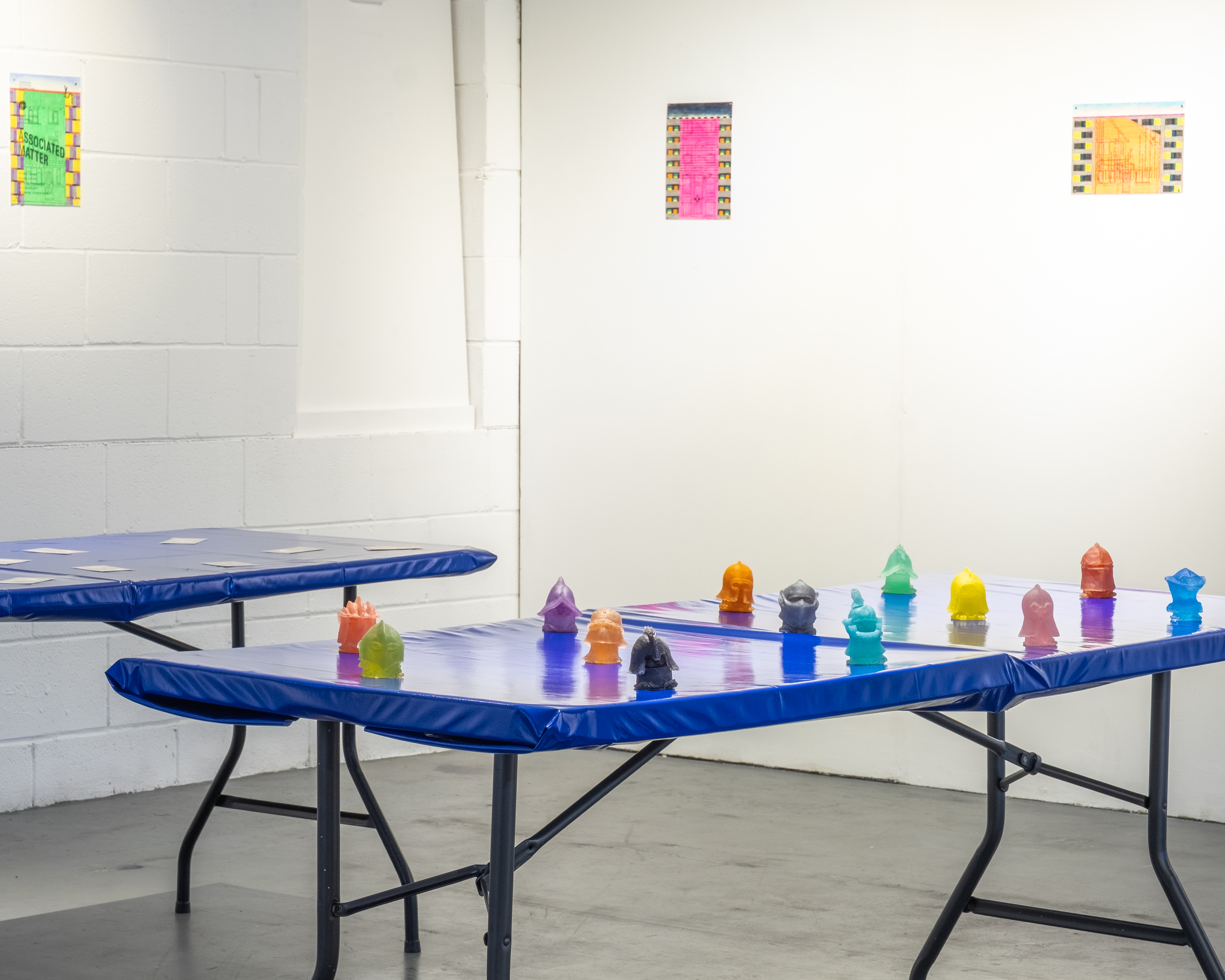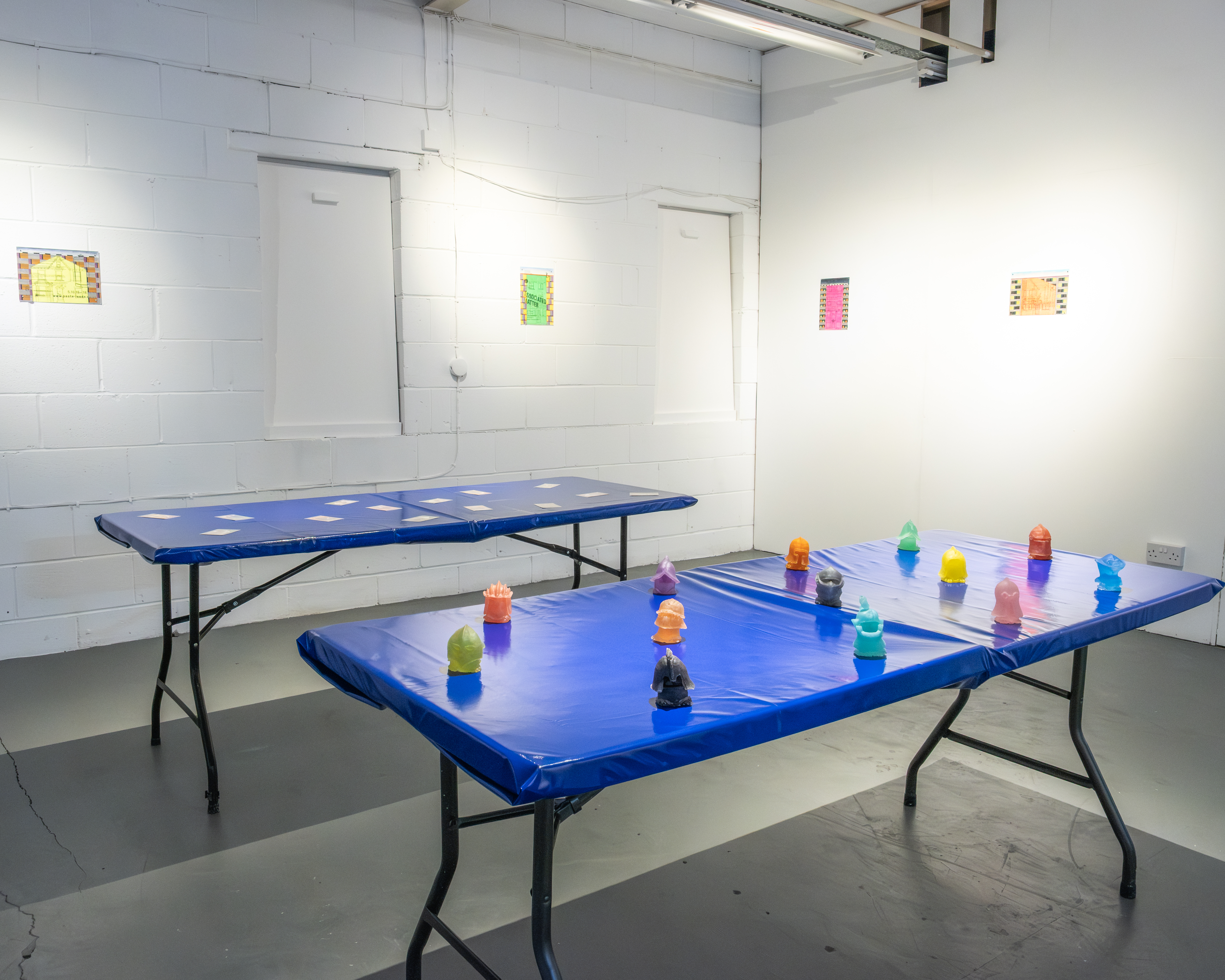 A bog is a mythological creature in Yorkshire folklore, a kind of mischievous hobgoblin. In the title, ‘bog’ could also refer to swamp or marshland. Due to the particular environmental conditions of bogs, organic material is often preserved where it might otherwise have decayed, allowing for precious historical discoveries (leather shoes; food; human or animal waste). In the title, the word ‘finds’ refers to this archeological possibility, and the thirteen figures are presented on a ‘finds table’ as if freshly dug up from the earth. Cast in resin, they also resemble collectible figurines, each wearing a different helmet from the Royal Armouries’ collection, presented as a kind of contemporary archeology.