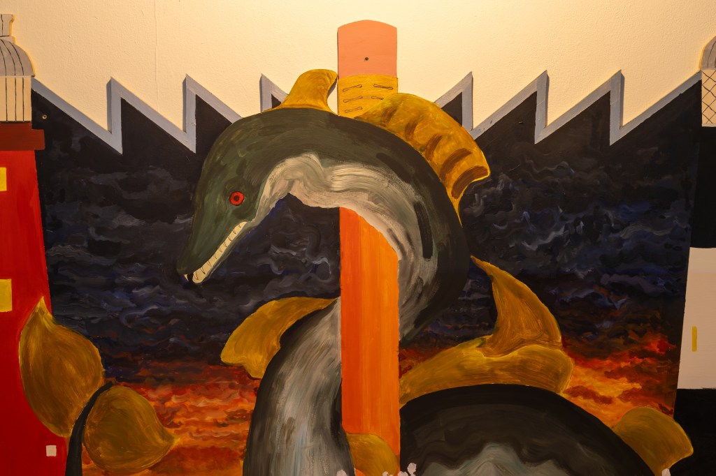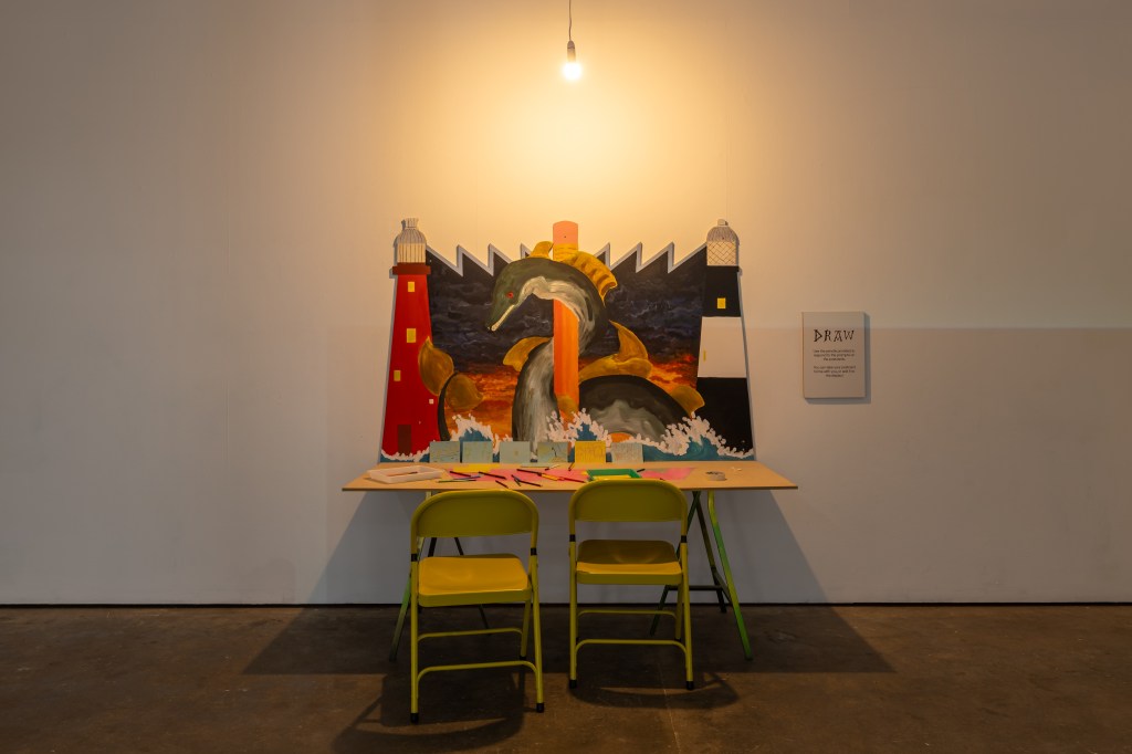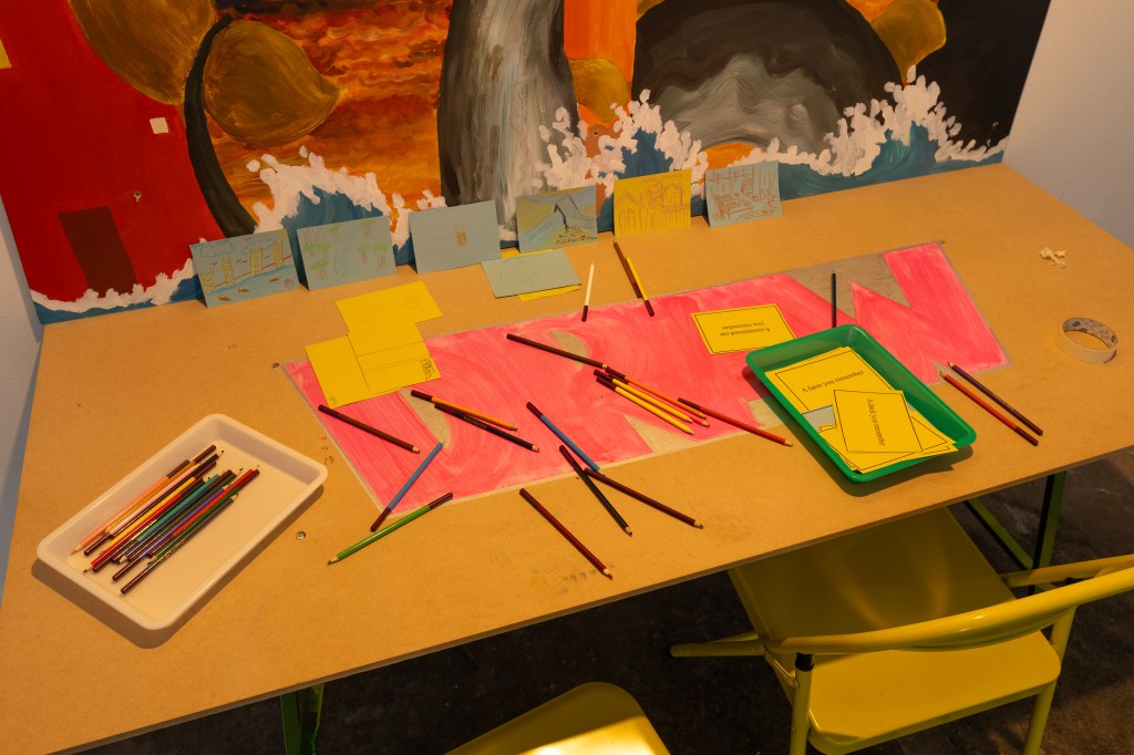 Here Pell invites visitors to the exhibition to engage in a similar creative process as his own, and think creatively about places with significance to them. The backdrop hints at the flashy and elaborate designs found on Hull Fair rides.