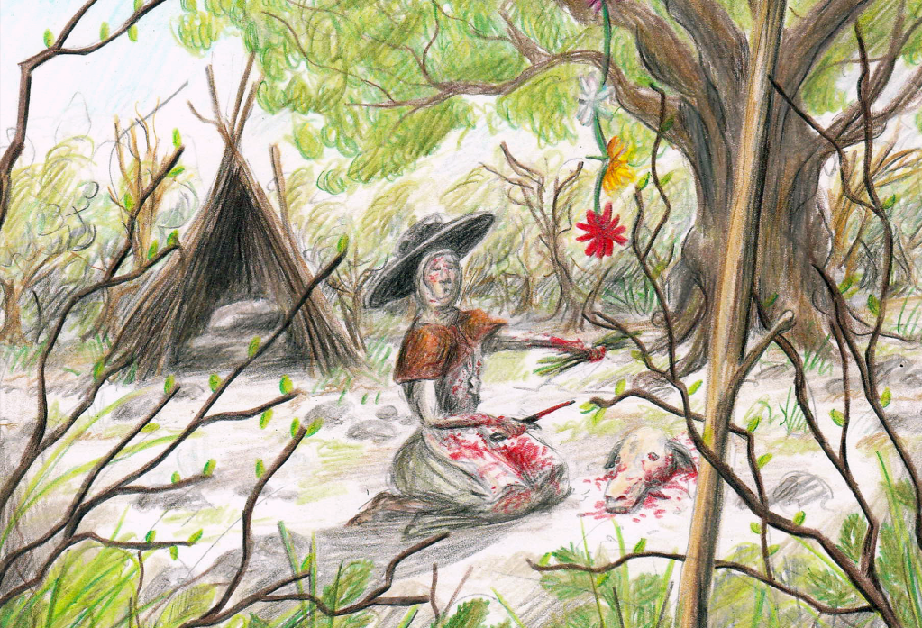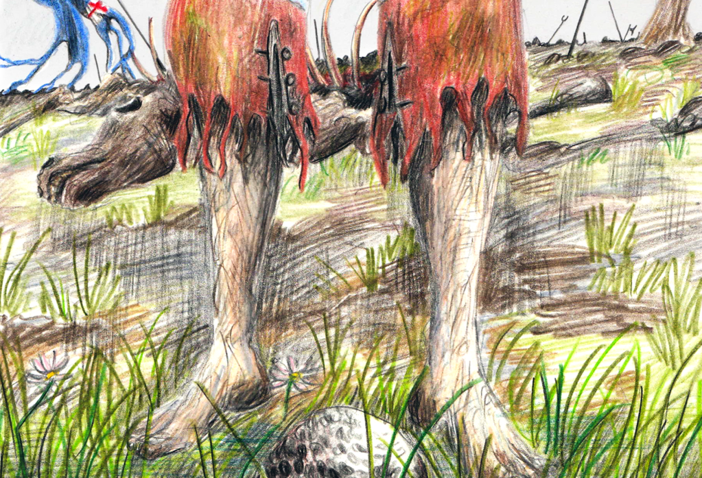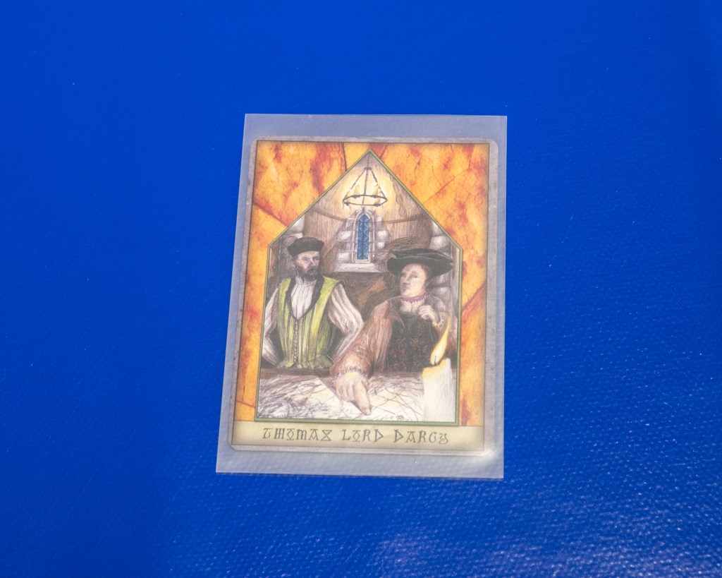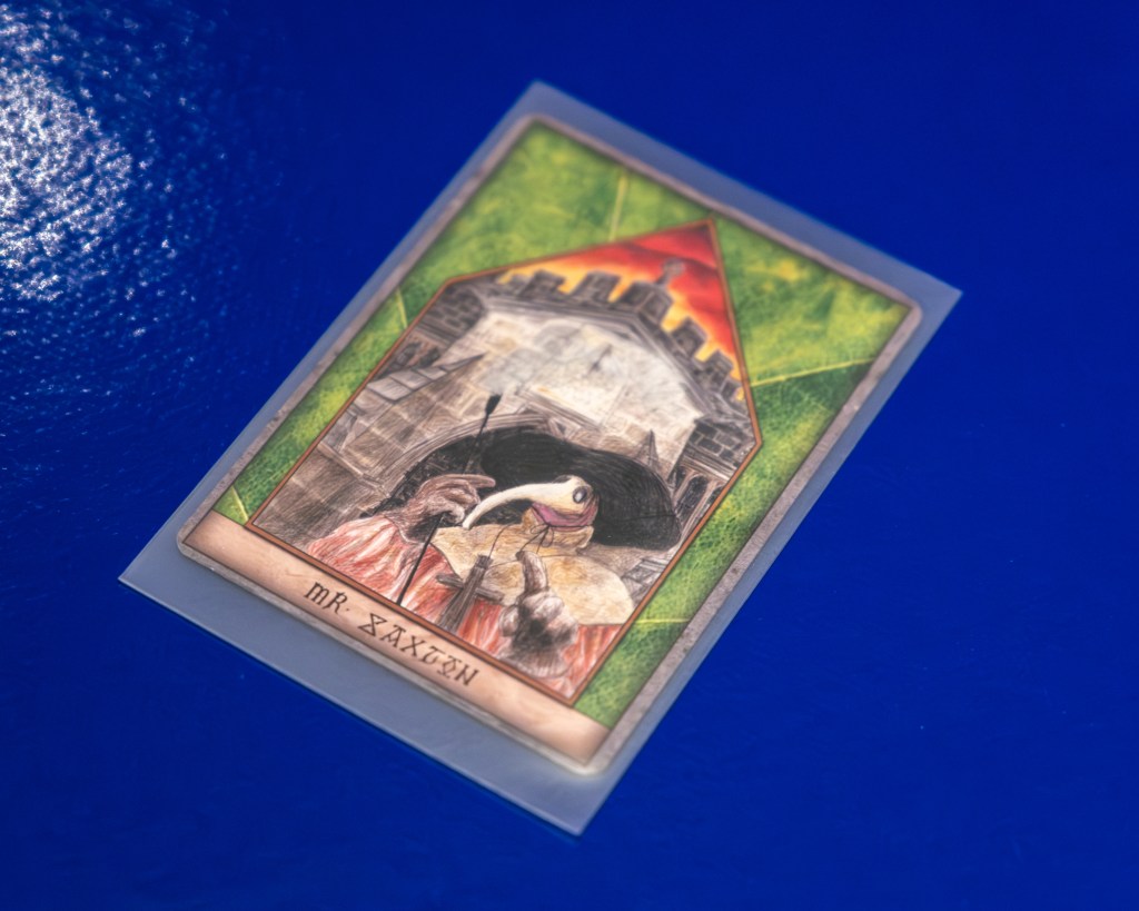 A series of fourteen illustrated cards inspired by collectible trading (or tactical) card games (TCGs). The title of the piece also imitates the standard format of how these TCGs are titled, e.g. ‘Magic: The Gathering’ or ‘Sorcery: Contested Realm’. The piece exists in a world where local social/working class history clashes with the mythology/folklore of West Yorkshire. The backgrounds of the cards are taken from scanned oak leaves, linking the work back to ᚪ (Oak). They are presented on an identical table to Bog Finds, yet here the connotations are of a gaming or tournament table.